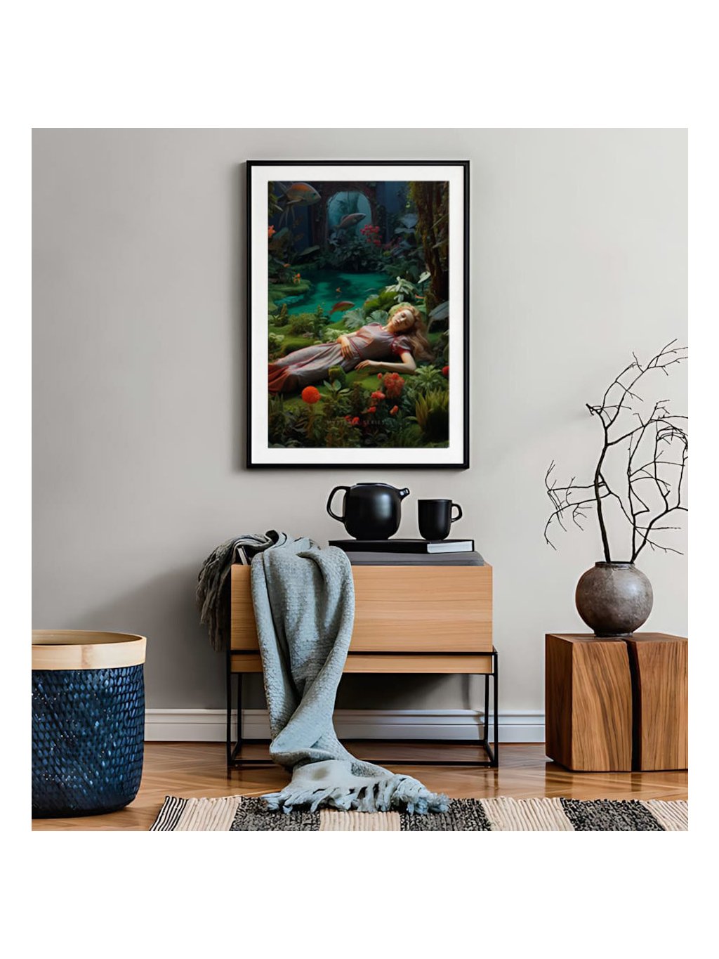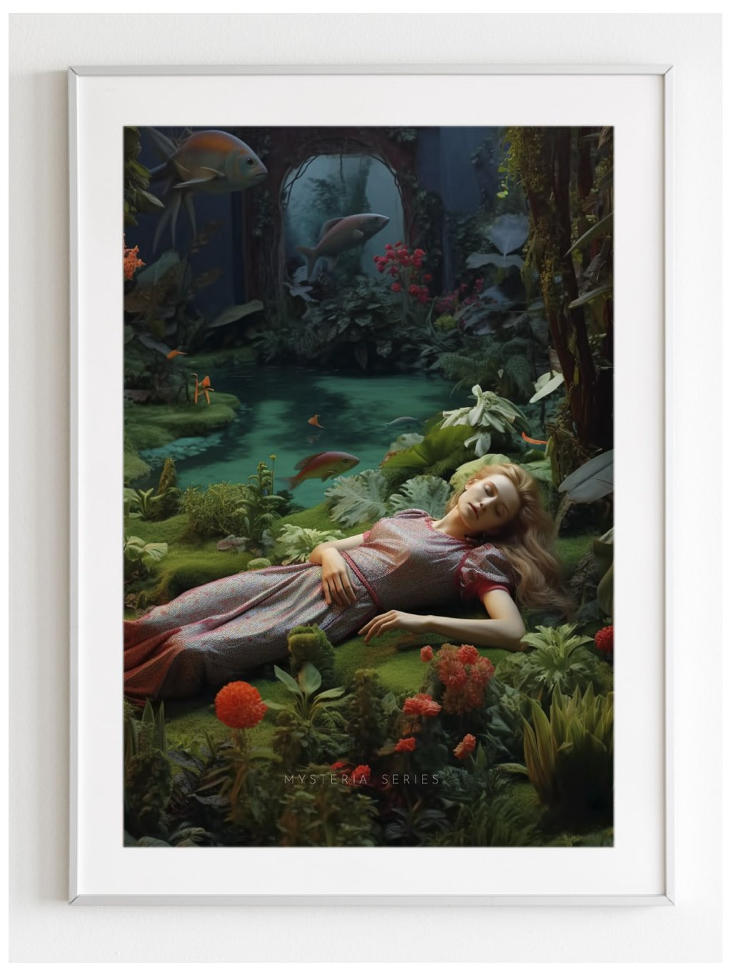 Plakát Tajemná zahrada, žena spící v tajuplné zahradě, s bílým okrajem.