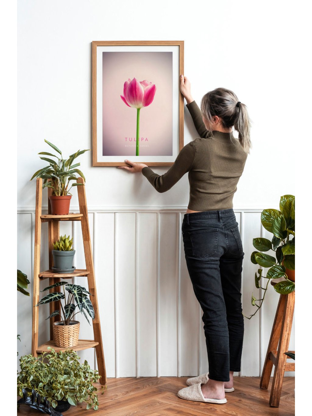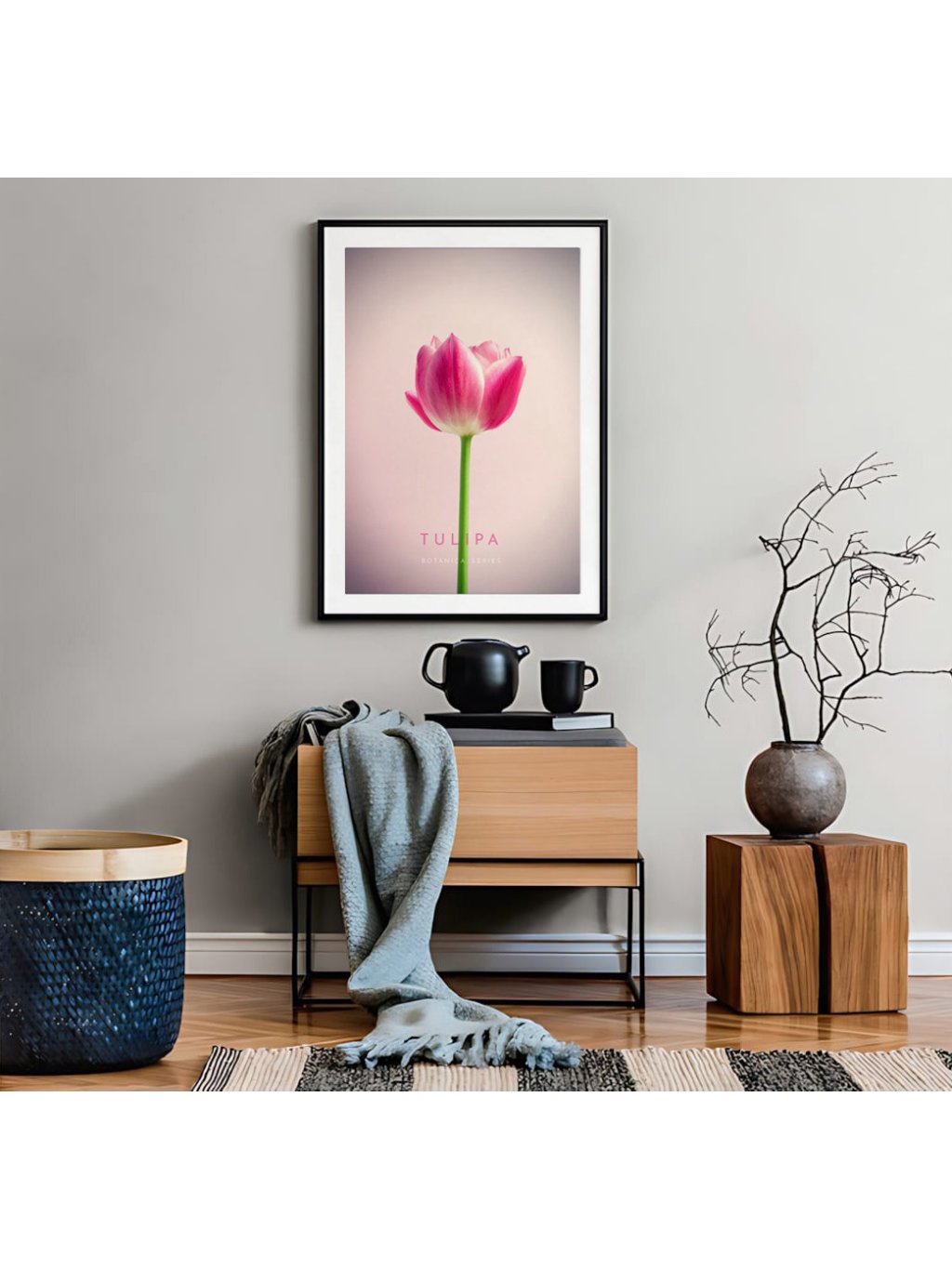 Plakát detail růžového květu tulipánu na světlém pozadí s bílým okrajem.