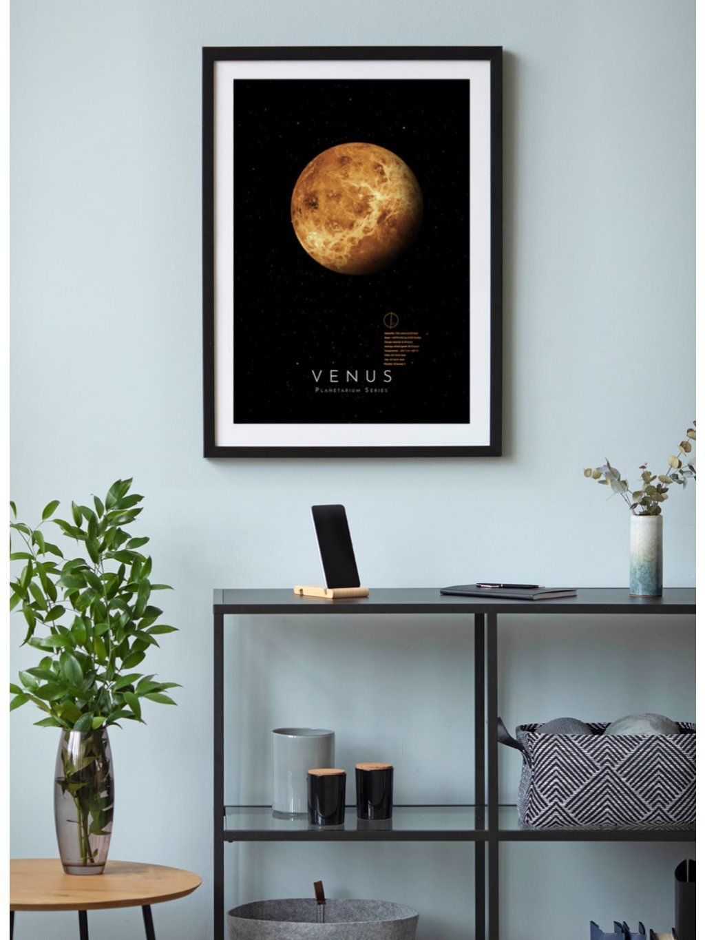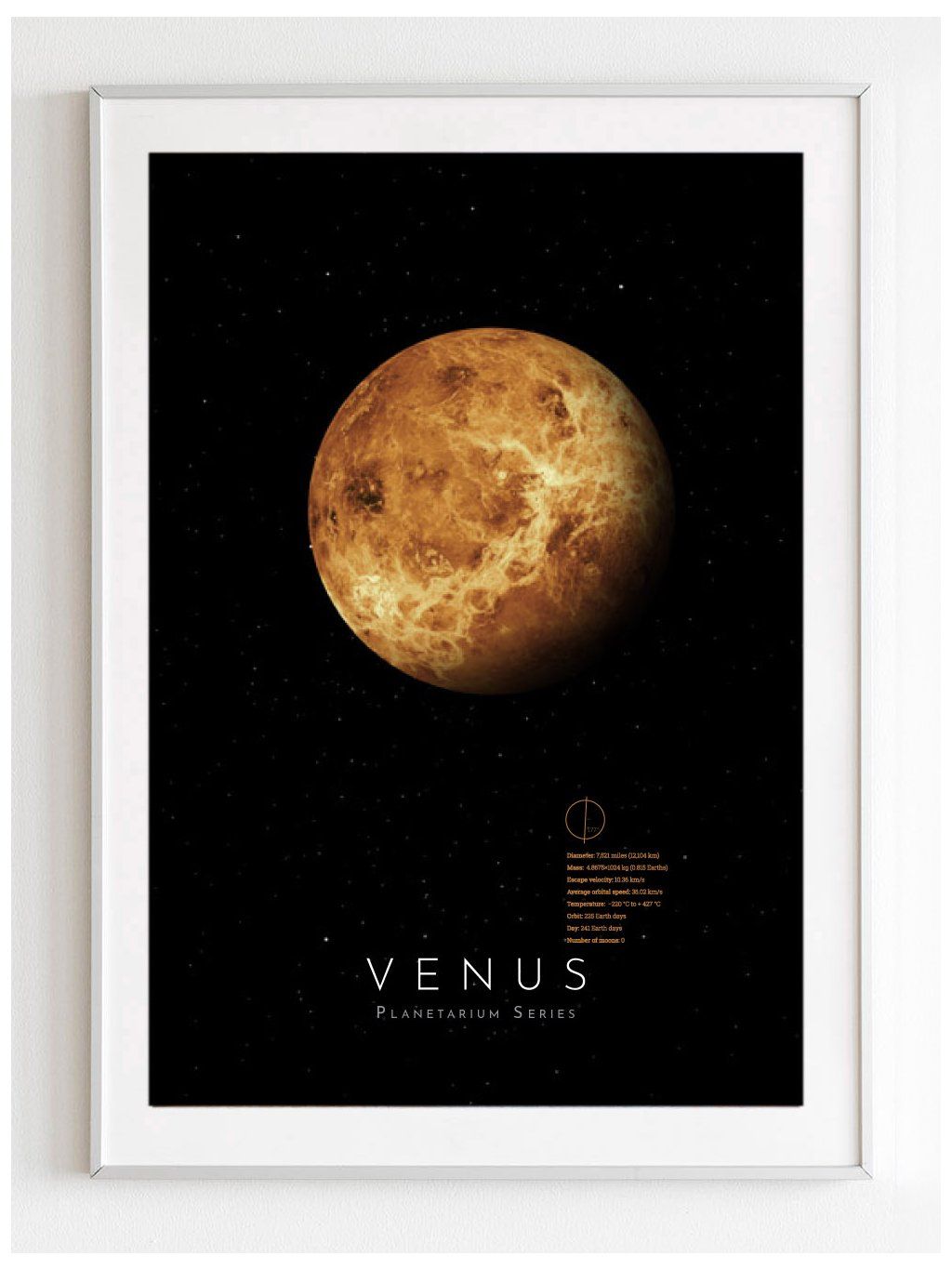 Plakát fotografie planety Venuše na černém pozadí se základními údaji (v AJ) o rozměrech, objemu, rychlosti oběhu a rotace, teplotě... atd.