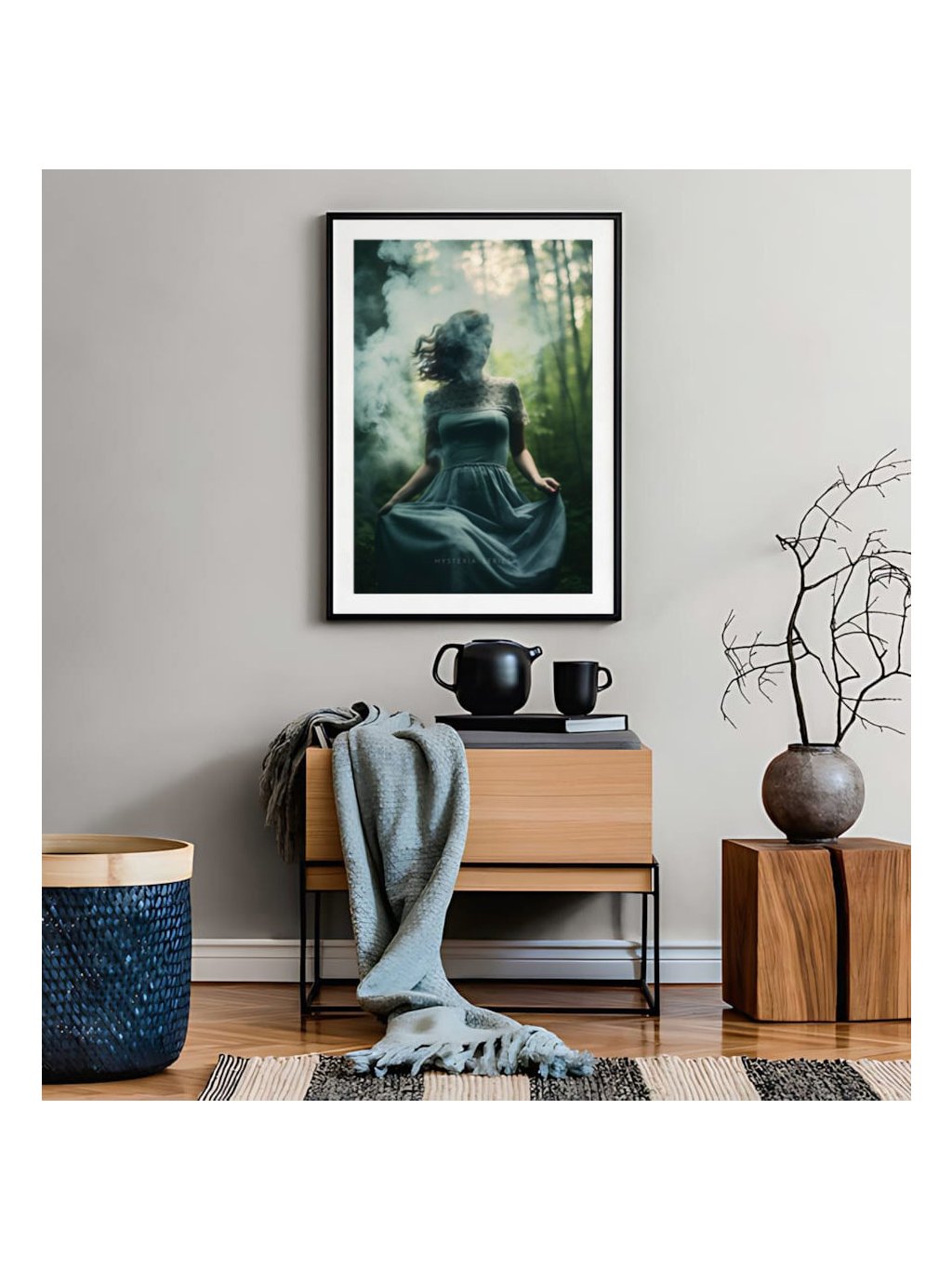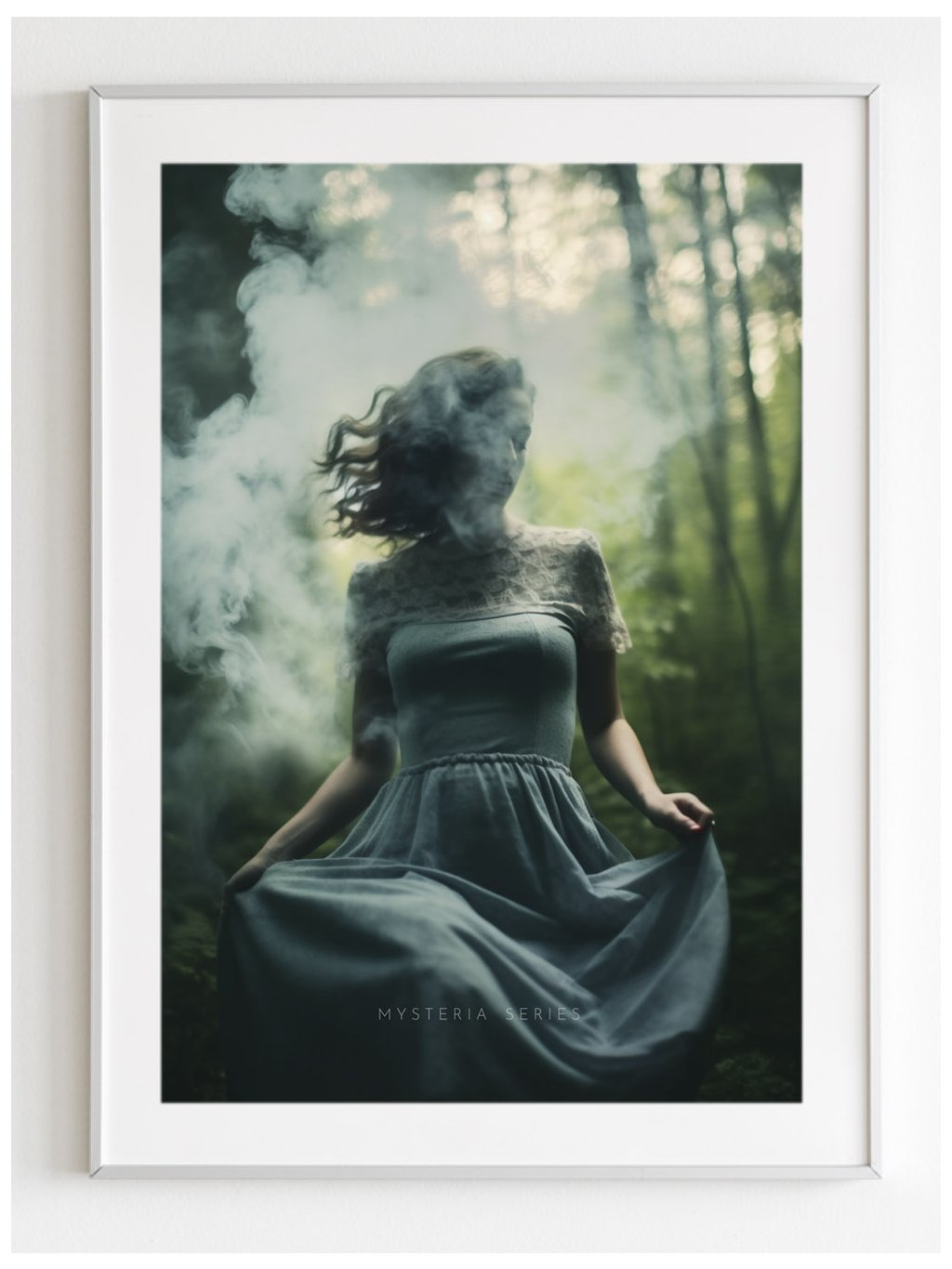 Plakát Tajemná dívka zahalená v dýmu, s bílým okrajem.
