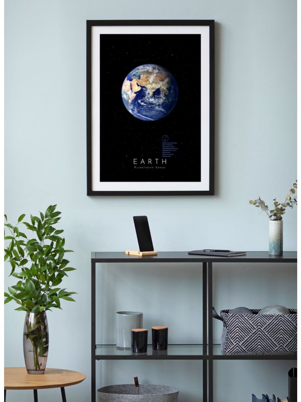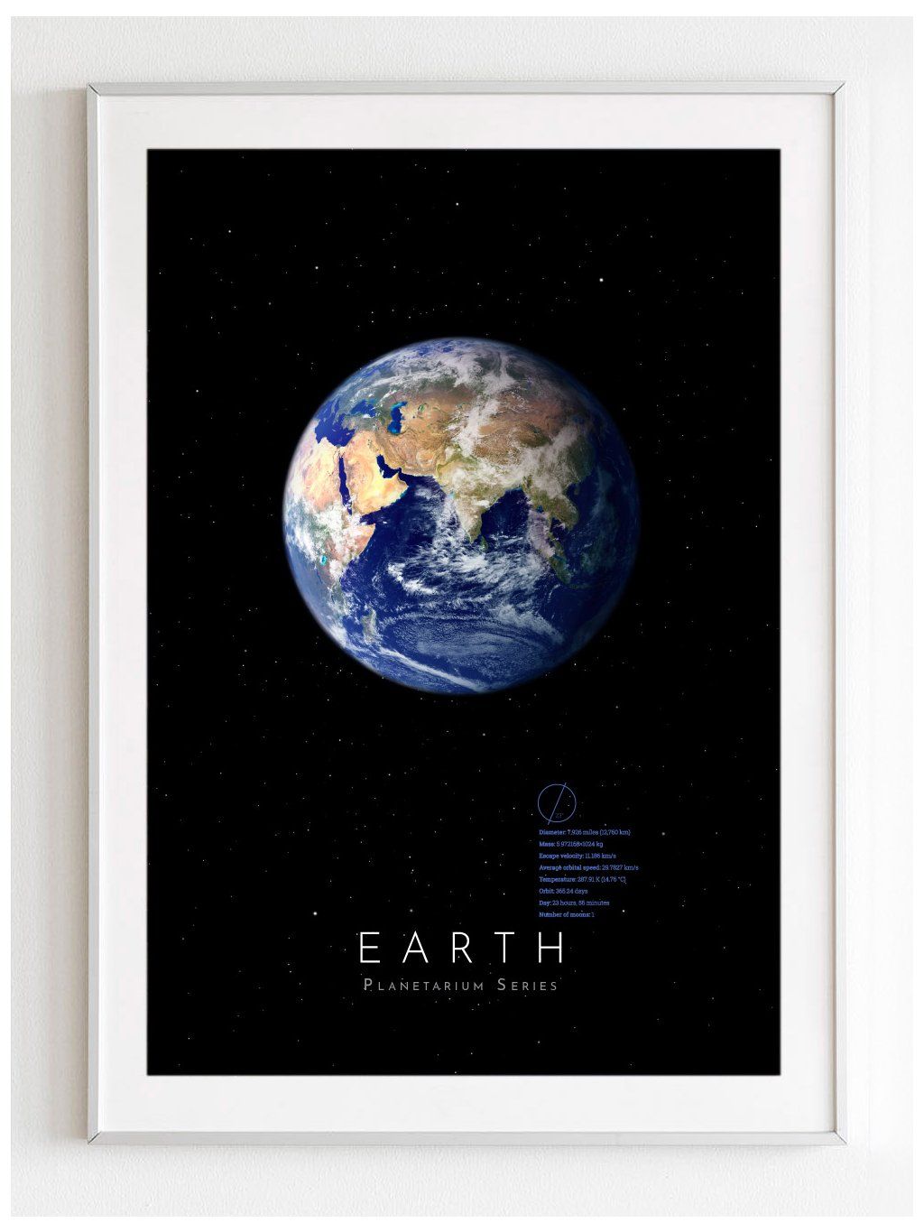 Plakát planeta Země s anglickým popisem s bílým okrajem.