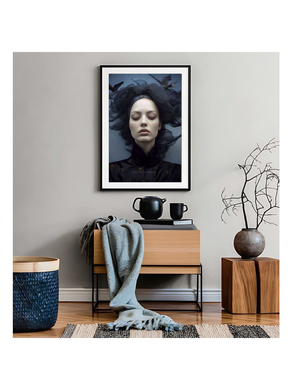 Plakát Portrét tajuplné snící ženy v černých šatech, s bílým okrajem.